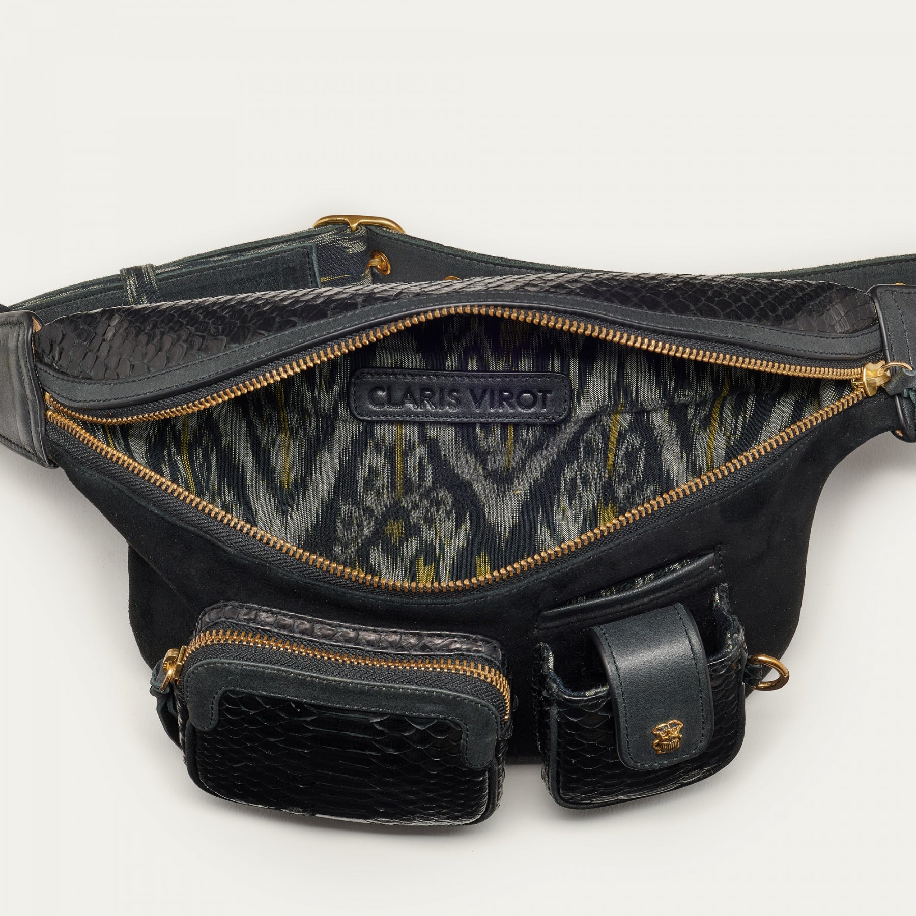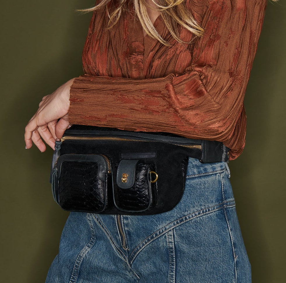 This python and leather belt bag is designed to be worn either around the waist or crossbody, letting you switch up your look as you please. With one main compartment and two small exterior pockets, Roméo is crafted to hold your essentials and make your daily outings easier!