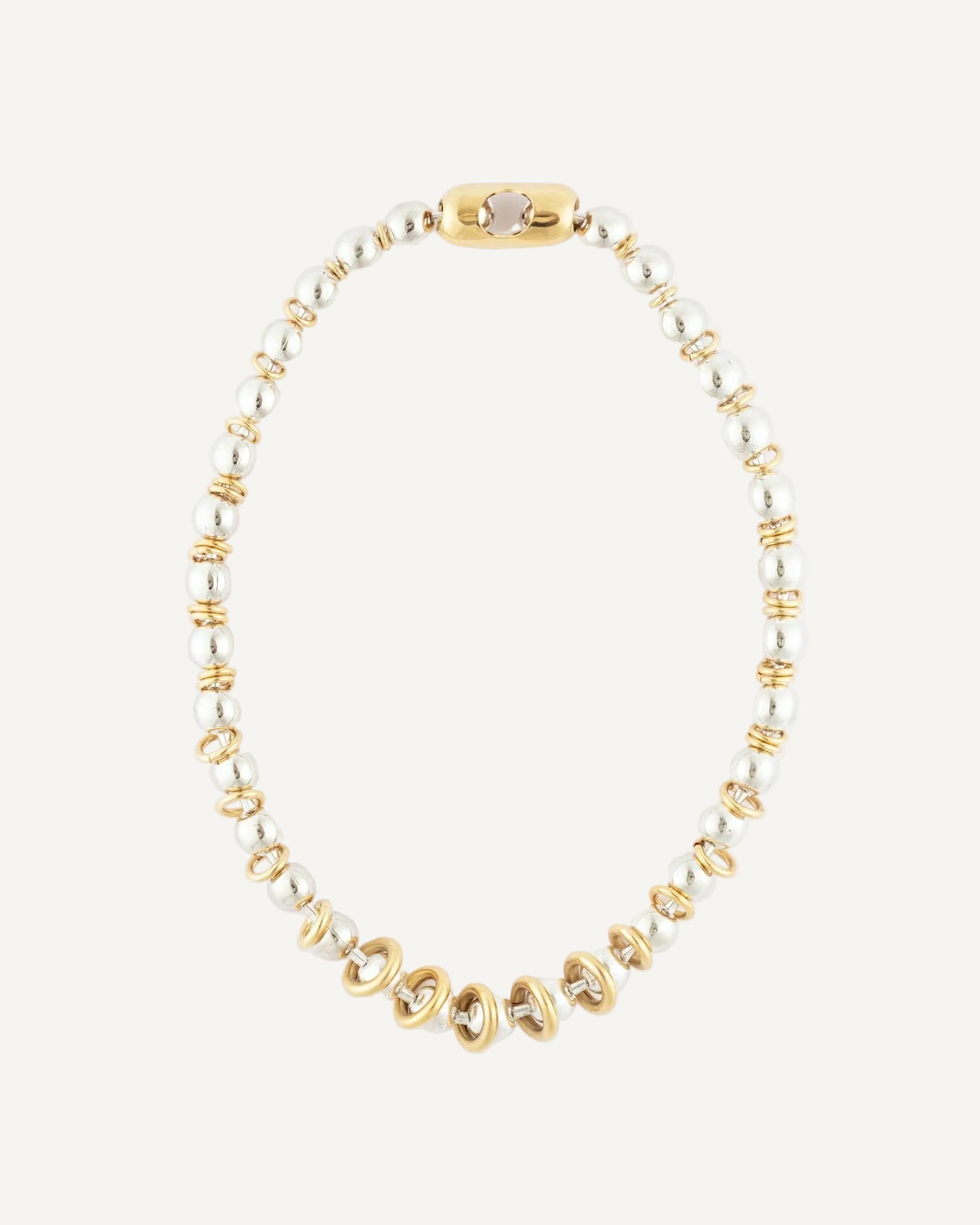 Le collier Bubble Argent se distingue par l'alternance de boules argentées et d'anneaux dorées, formant un équilibre audacieux et raffiné. À la fois intemporel et plein de caractère, il apporte une touche d'éclat et de modernité à tous vos looks.