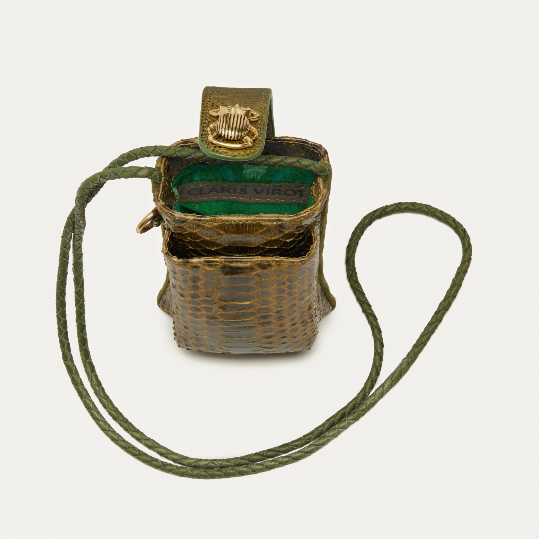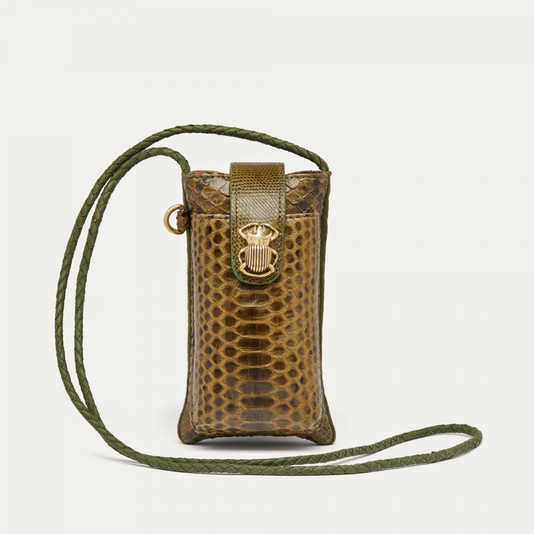 Cet étui en python et cuir suédé conçue afin de transporter votre téléphone est réalisée à la main. Le double Marcus est doté de deux compartiments. La poche principale vous permettra d'accueillir votre smartphone et la poche avant vos lunettes. Ces deux poches se ferment à l'aide d'un rabat aimanté, orné d'un scarabée doré. À l'arrière, 3 fentes vous permettront d'y ranger vos différentes cartes.