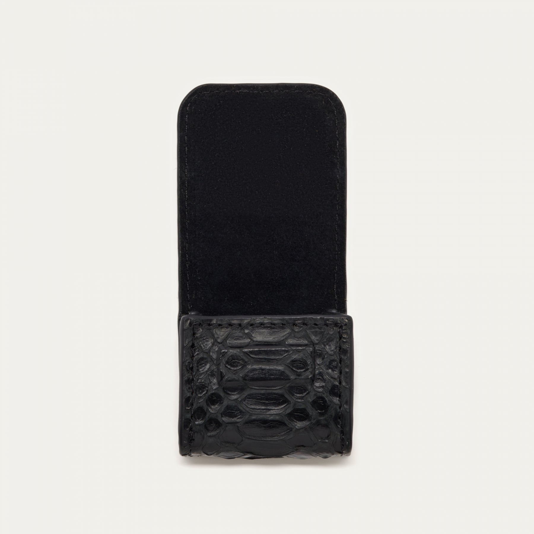 Étui à AirPods Jamie entièrement composé de python est orné d'une beetle dorée à l'avant. Son mousqueton vous permettra de l'accrocher aussi bien à vos passants de pantalon, qu'à votre sac ou étui de téléphone portable.