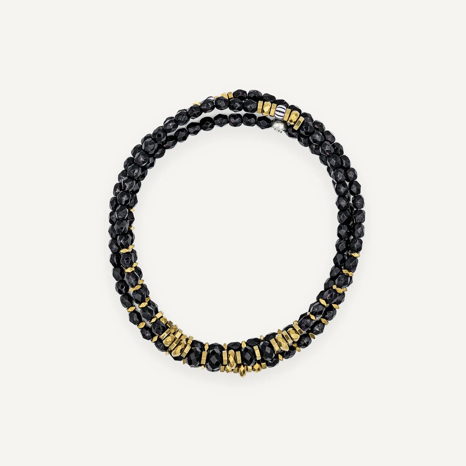 Composé de perles de bohème et d'hématite, ce bijou peut se porter en collier ou en bracelet 3 tours grâce à son fil élasthanne à mémoire de forme.