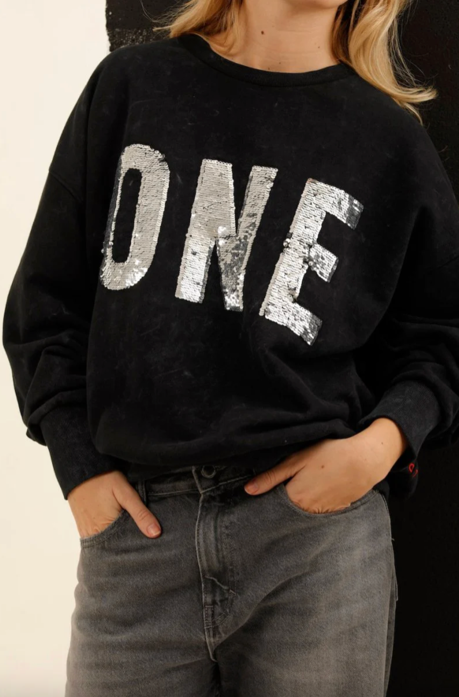 Avec sa coupe ample et son mot « ONE » brodé en sequins, il mixe confort et féminité.
